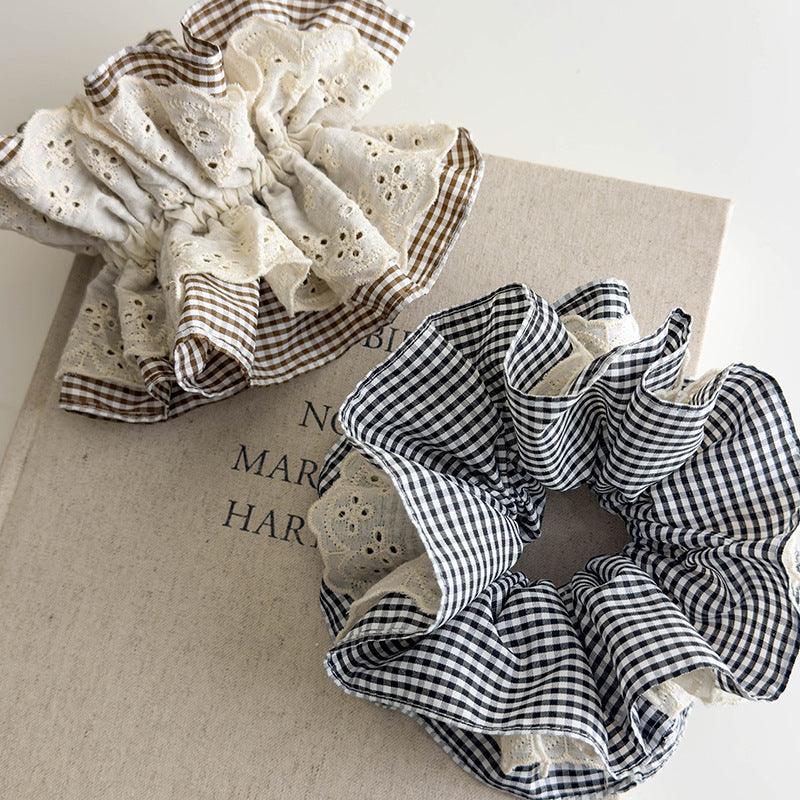 E廠-雙層蕾絲格子大腸髮圈女法式復古芭蕾風頭繩氣質小香風丸子頭髮飾「26254」24.11-2