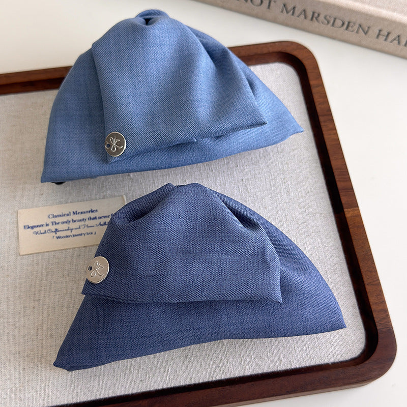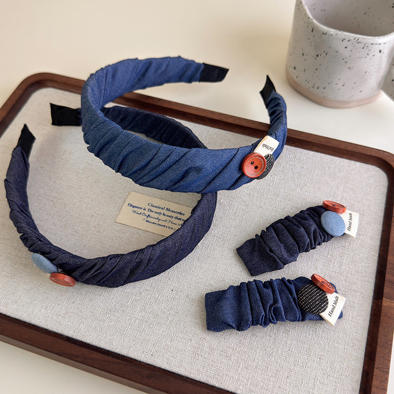E廠-甜酷牛仔髮箍韓版藍色系小眾設計紐扣斜紋褶皺布藝頭箍高顱頂頭飾「27246」25.07-4