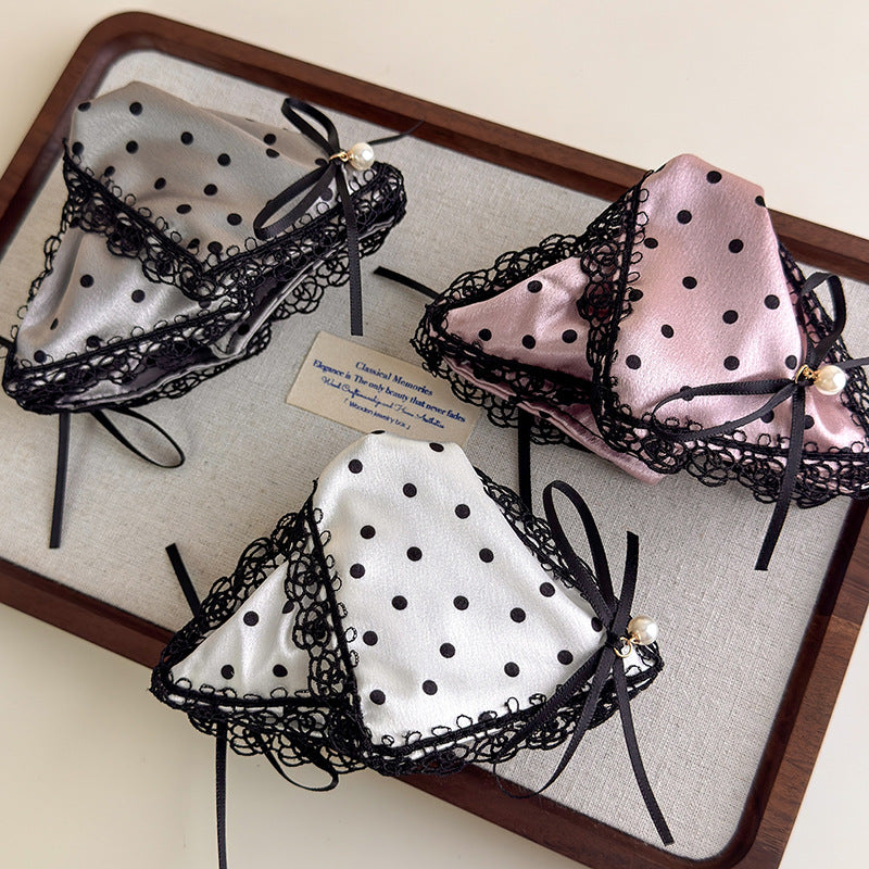 E廠-緞面波點蕾絲蝴蝶結珍珠抓夾光澤感髮飾復古風三角抓夾鯊魚夾髮飾「27252」25.07-4