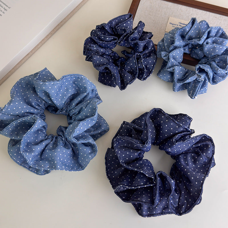 E廠-韓版復古波點牛仔雙層褶皺大腸髮圈2025新款低馬尾髮繩扎丸子頭女「27286」25.08-1