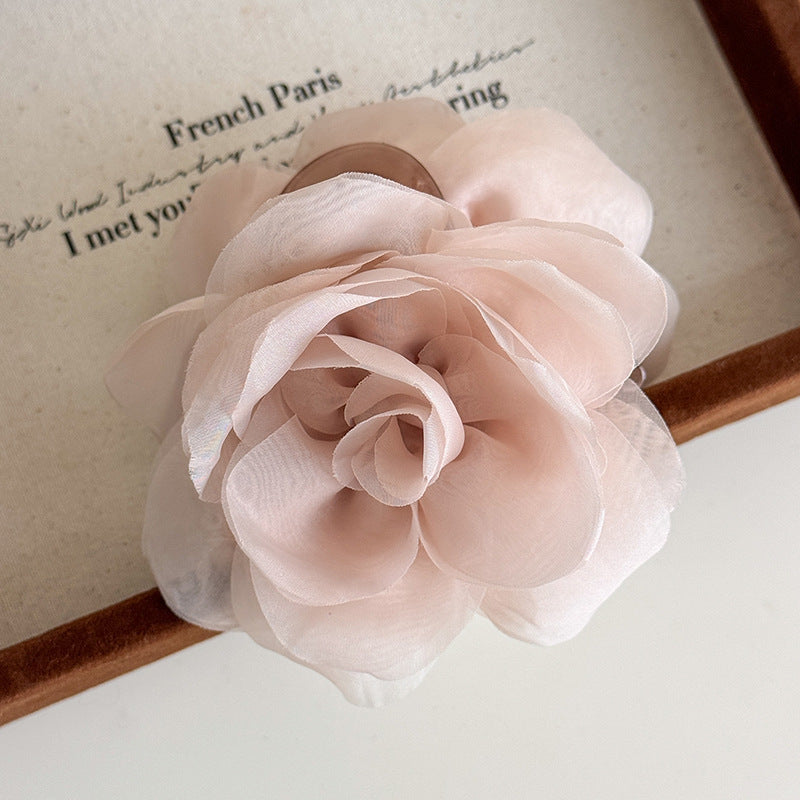 E廠-氛圍感杏粉色網紗玫瑰花朵半扎髮抓夾2025新款海邊鯊魚夾頭花髮飾「27198」25.08-1