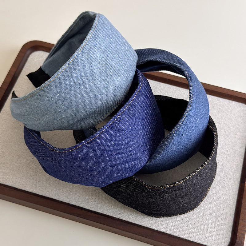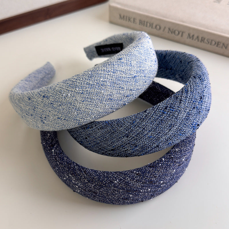 E廠-韓系藍色牛仔髮箍簡約時尚百搭細格紋寬邊頭箍增高顱頂髮帶頭飾「27244」25.07-4