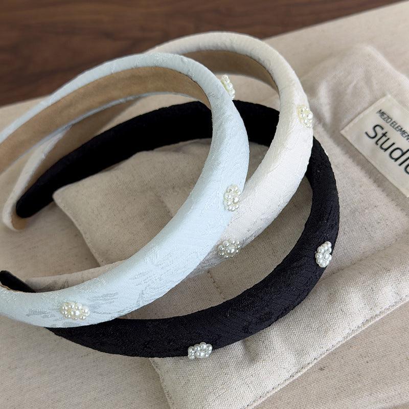E廠-新中式國風刺繡珍珠花朵海綿髮箍2025新款小清新頭箍高顱百搭髮卡「26470」25.01-3