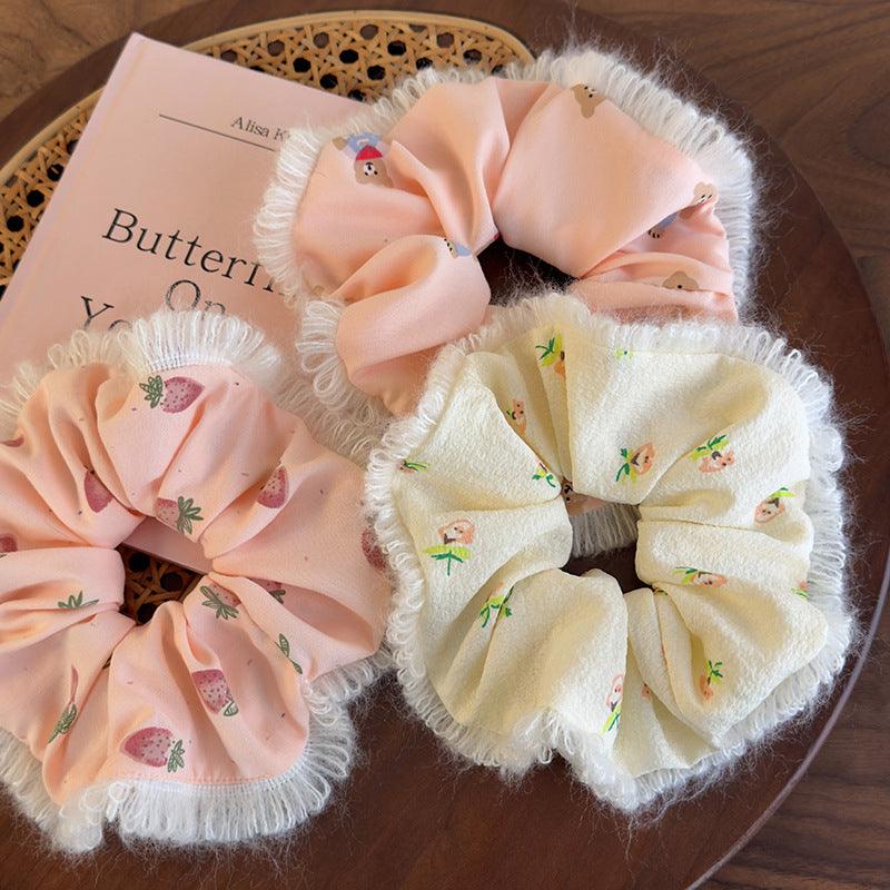 E廠-田園風碎花小熊毛絨大腸髮圈2024年新款高級感丸子頭大號髮飾頭繩「26444」25.01-2