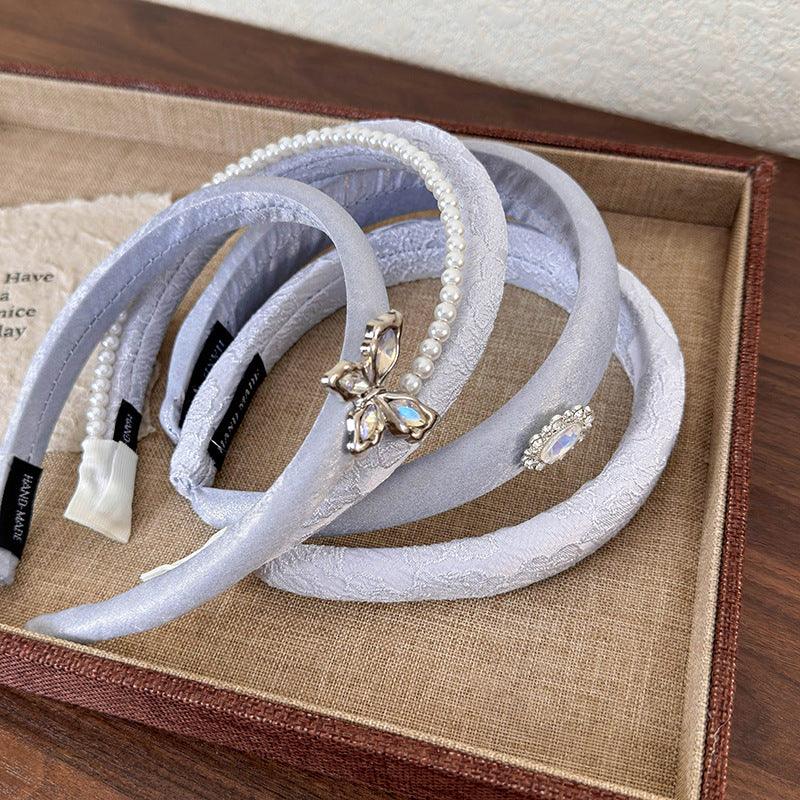 E廠-海鹽藍蝶~法式水鑽蝴蝶珍珠髮箍藍色布藝頭箍優雅公主頭髮卡頭飾「25460」24.05-4