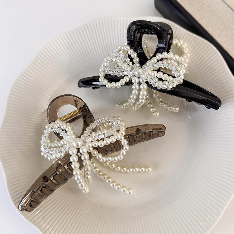 E廠-溫柔珍珠水晶蝴蝶結盤髮抓夾女2024新款高級感氣質鯊魚夾髮夾頭飾「25153」24.04-1