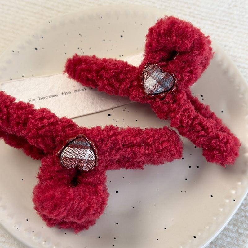 E廠-愛心格紋羊羔毛抓夾大號鯊魚夾毛絨髮夾女後腦勺新款秋冬夾子髮飾「26312」24.11-5