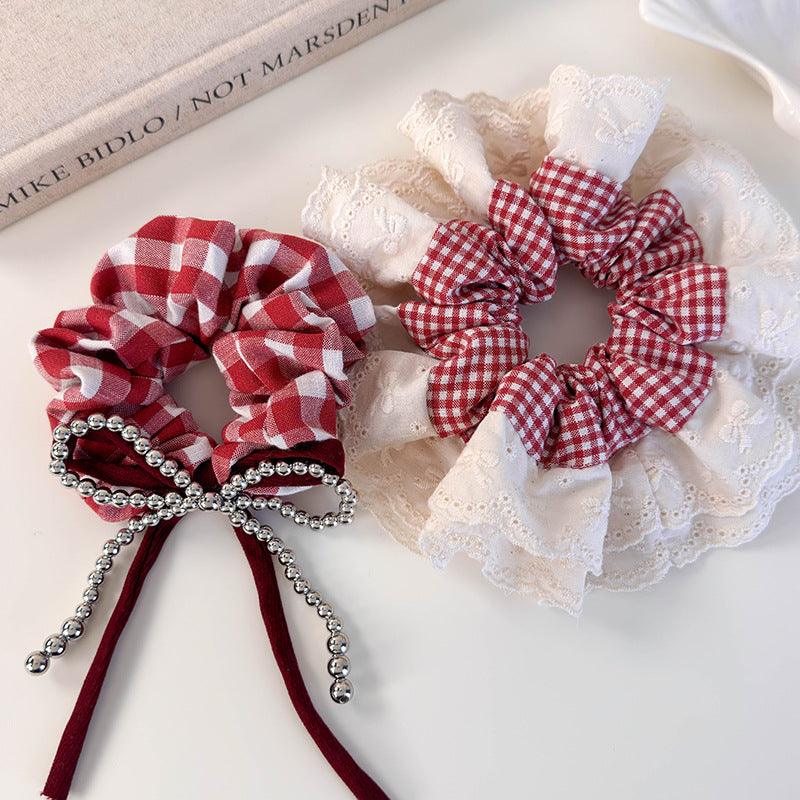 E廠-復古紅格子氛圍感大號蝴蝶結大腸圈丸子頭髮圈蕾絲花邊髮繩女「26168」24.10-4