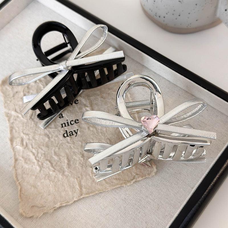 E廠-ins甜酷氣質銀色蝴蝶結髮夾女2024新款後腦勺盤髮鯊魚夾抓夾髮飾「25603」24.06-3