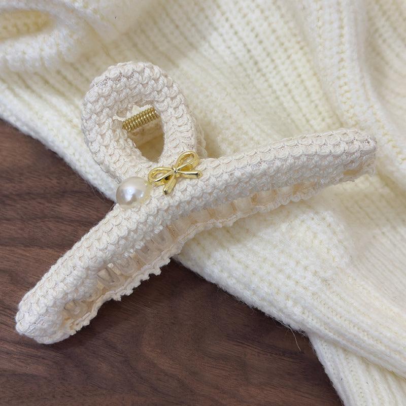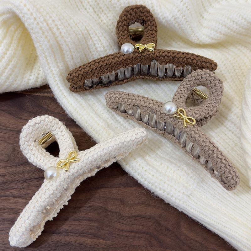 E廠-秋冬新款手工毛線編織奶茶色蝴蝶結珍珠髮夾後腦勺盤髮鯊魚夾髮飾「26318」24.11-5