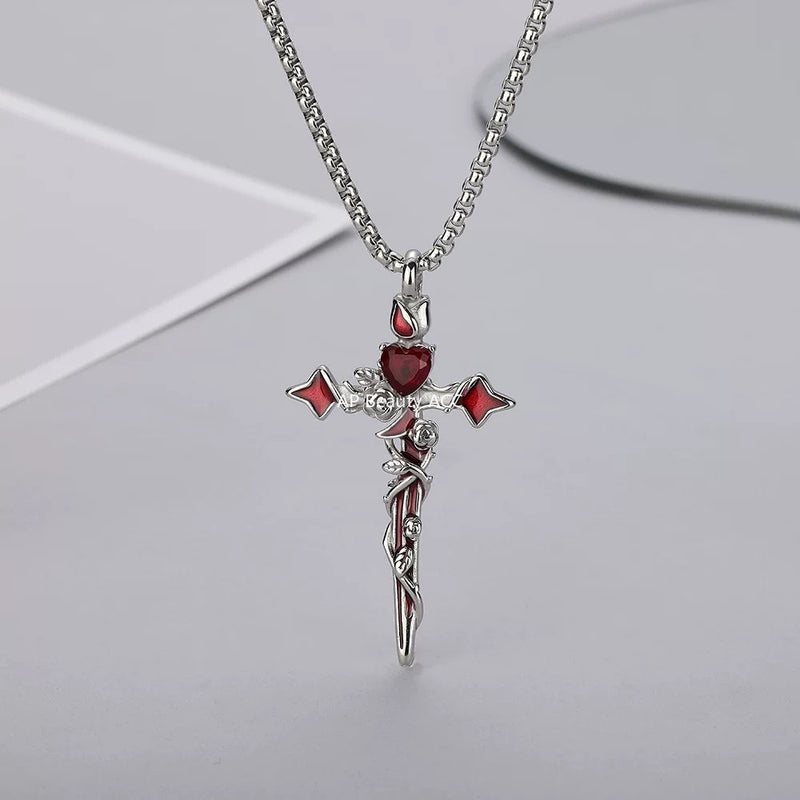 G廠-荊棘玫瑰十字架項鍊男個性高級感鑲鑽愛心鎖骨鏈時尚百搭花朵吊墜「X1188」25.10-1