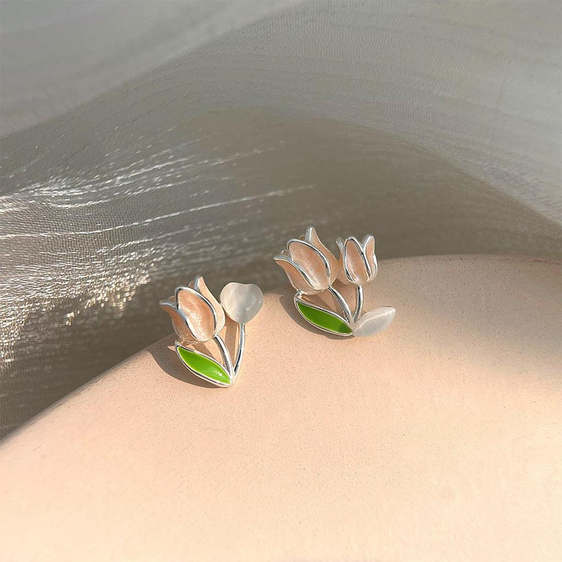 A廠-清新甜美不對稱玻璃貓眼石鬱金香花朵耳環女氣質優雅可愛新款耳環「4720」24.08-3