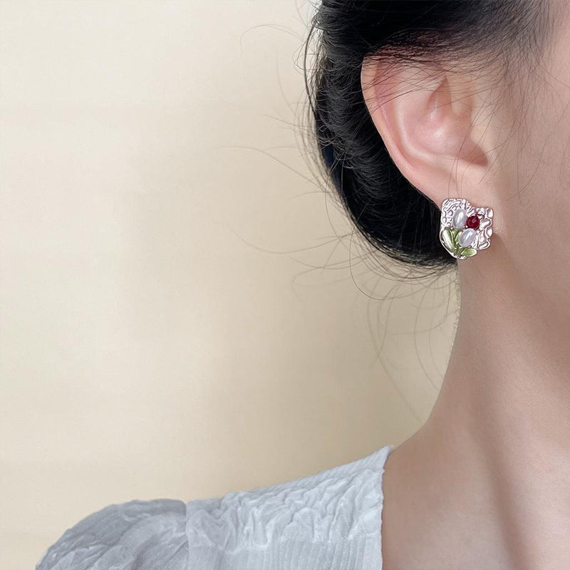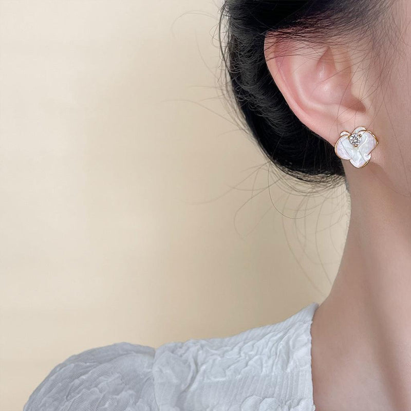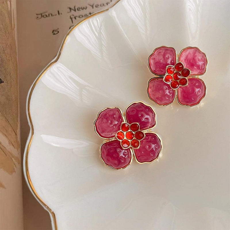 A廠-森系清新甜美 仙氣質鍍14K玻璃水晶琺瑯滴油立體花朵耳釘工廠耳飾「4832」24.09-2